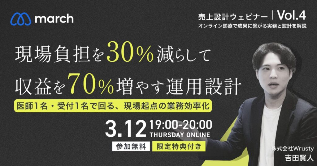 本ウェビナーでは、実際にスタッフ工数を30%削減しながら、患者対応の質を落とさずにオンライン診療を運用できるようになった設計・導線・役割分担の考え方を解説します。